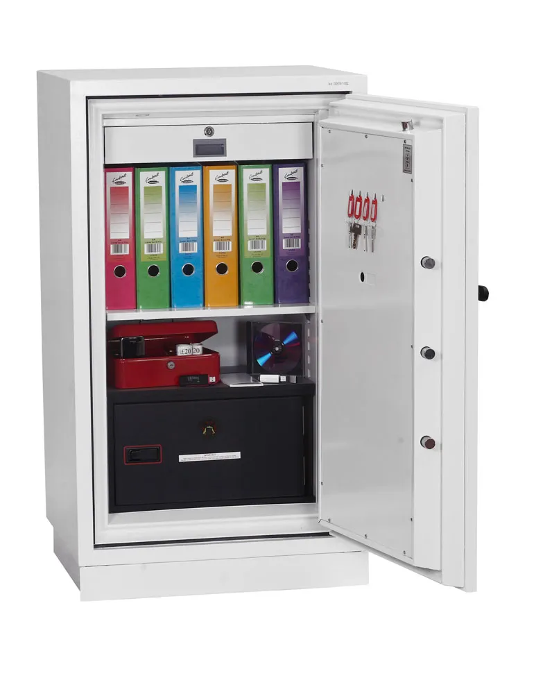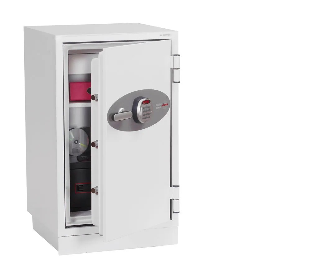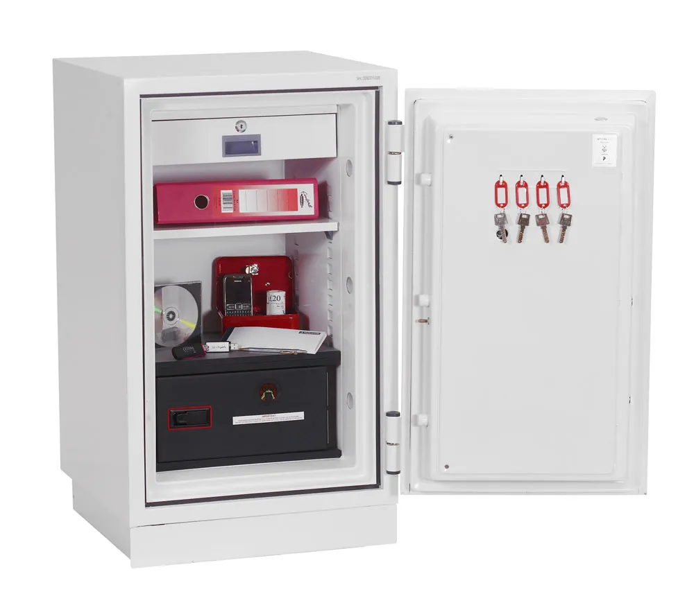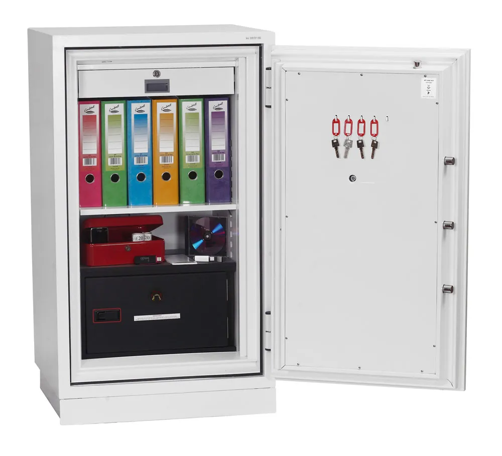 FIRE PROTECTION (PAPER) – Tested to Swedish NT Fire 017 – 90 Paper (Size 1 or 2) or 120 Paper (Size 3), providing 90 or 120 minutes fire protection respectively for paper documents | FIRE PROTECTION (DATA) – Tested to Swedish NT Fire 017 – 90dis (Size 1 or 2) or 120dis (Size 3), providing 90 or 120 minutes fire protection respectively for computer diskettes, tapes and all forms of data storage | FIRE PROTECTION (DIGITAL MEDIA) – Tested to MTC – DIP120 – 60DM fire test standard, providing 60 minutes fire protection for digital media, DVD’s, USB memory sticks and hard drives | SECURITY PROTECTION – Recommended for an overnight cash risk of £2,500.00 or £25,000.00 valuables | DROP TEST – Fire and impact tested from 9.1 metres for resistance to the impact of falling through the burning floors of a building | FITTINGS – Each safe comes complete with a height adjustable shelf, lockable drawer and internal key hooks | FIXING – Ready prepared for floor fixing with fixing bolts for concrete supplied | SPECIAL FEATURES – Fitted with automatic slam shut door locking | COLOUR – Finished in a high quality scratch resistant paint RAL9003 White